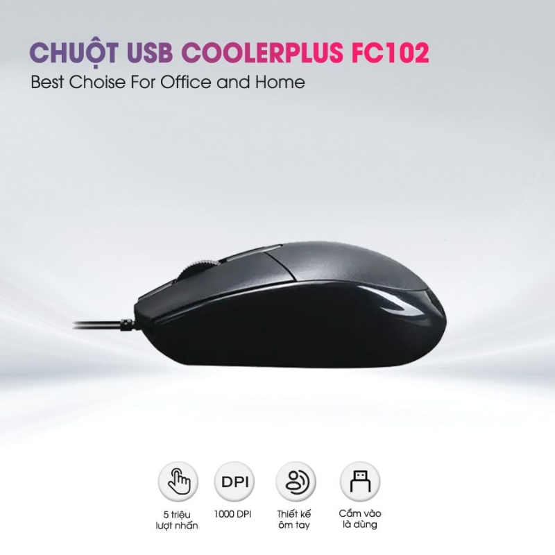 Mã sp: FC102. Giao tiếp: USB (chiều dài 1.8m). Độ phân giải: 1000 DPI. Chuột có thể vận hành trên mọi bề mặt, không cần tấm lót chuột vẫn hoạt động tốt. Thân chuột được thiết kế thon gọn, độ cong vừa phải ôm theo lòng bàn tay cho cảm giác cầm nắm thoải mái đồng thời giảm mỏi cổ tay khi sử dụng trong thời gian dài. Bảo hành: 12 tháng