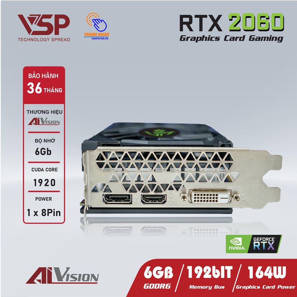 AIVISION GeForce RTX 2060 được trang bị bộ nhớ GDDR6 6GB, giúp xử lý các tác vụ đồ họa phức tạp và game nặng một cách mượt mà. Với xung nhịp 1680 MHz và Memory Clock 14000 MHz, card màn hình này đảm bảo hiệu suất vượt trội và ổn định.