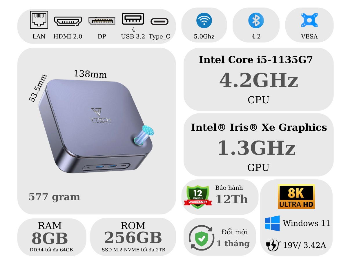 Tăng cường hiệu suất công việc với Mini PC VTECH VTPB124U trang bị vi xử lý Intel Core i5 thế hệ 11 mạnh mẽ, hỗ trợ đa nhiệm mượt mà cùng khả năng bảo mật tối ưu bằng khóa vân tay.