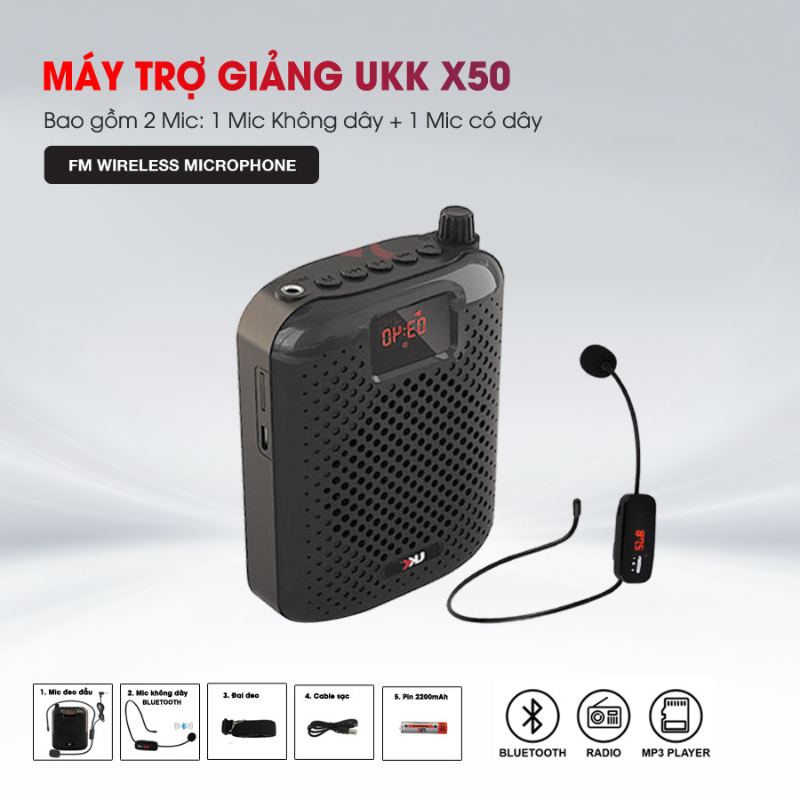 Với Micro không dây đi kèm, X50 có thể thu phát tốt ở khoảng cách 20 - 25m, khuếch đại chuyên nghiệp, to, rõ, phản hồi thấp. Thoải mái và thuận tiện sử dụng cho giáo viên, huấn luyện viên, hướng dẫn viên du lịch, thuyết trình. X50 có chức năng FM RADIO, tự động tìm kiếm và lưu các đài phát thanh.