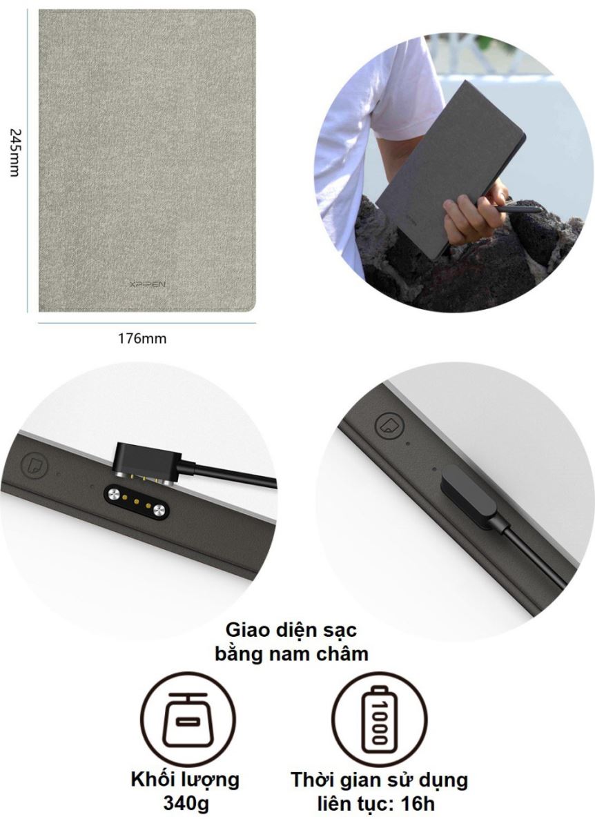 Bên ngoài bao bởi vải da PU, họa tiết và màu xám tạo nên vẻ sang trọng bắt mắt, thiết kế lại cực kỳ gọn nhẹ, bạn có thể dễ dàng cầm Note Plus trên tay hoặc bỏ vào túi xách nhỏ. XP-Pen Note Plus hoạt động trên iOS và Android. Bạn có thể kết nối trực tiếp iPhone cũng như điện thoại và máy tính Android với chiếc bảng ghi chú thông minh này và bắt đầu viết, sao lưu và vẽ bất cứ lúc nào ở bất cứ đâu với sự tiện lợi và hiệu quả thật sự ưu việt mà nó đem lại.