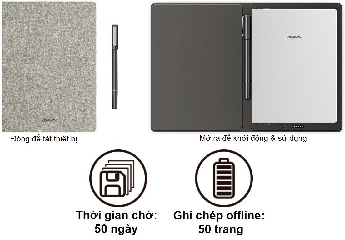 Sổ tay digital XP-Pen Note Plus được trang bị công nghệ Hall Switch - cảm biến phát hiện từ tính tiên tiến. Mở sổ ra để bật thiết bị và đóng lại để nó tự động vào chế độ nghỉ. Pin có thể kéo dài 50 ngày chờ, cùng với đó là khả năng lưu trữ ngoại tuyến (offline) lớn đến 50 trang, cho phép bạn dễ dàng lưu lại ý tưởng bất cứ khi nào và bất cứ đâu.