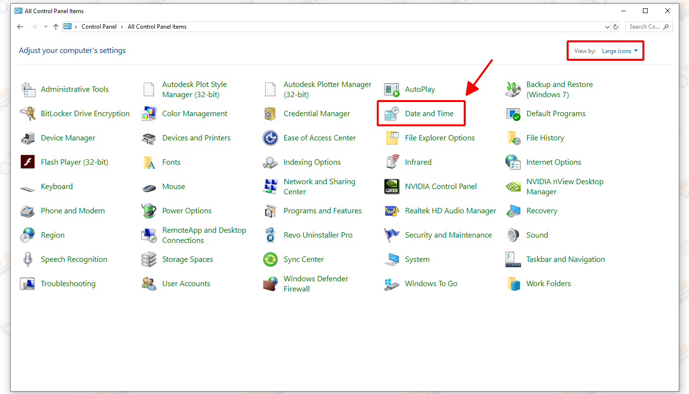 Thực hiện: Vào “Control Panel” (phần View by: bạn để là “Large icons”) => sau đó tìm đến phần “Date and Time”.