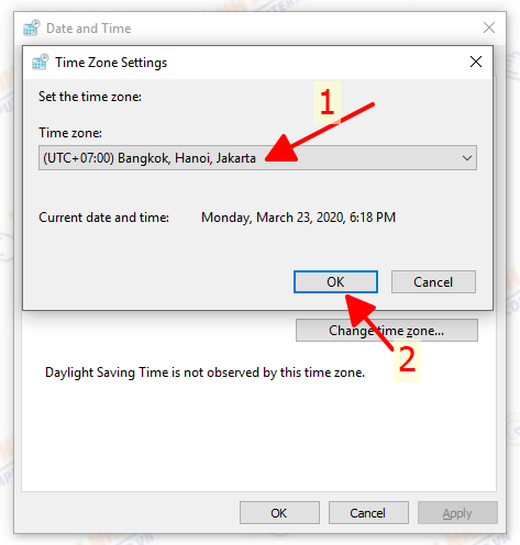 Cửa sổ Date and Time hiện ra, bạn để ý xem tại phần Time zone đã đúng với múi giờ của nơi bạn đang ở chưa. Ví dụ mình đang ở Việt Nam thì để múi giờ là (UTC +07:00) Bangkok, Hanoi, Jakarta nhé.