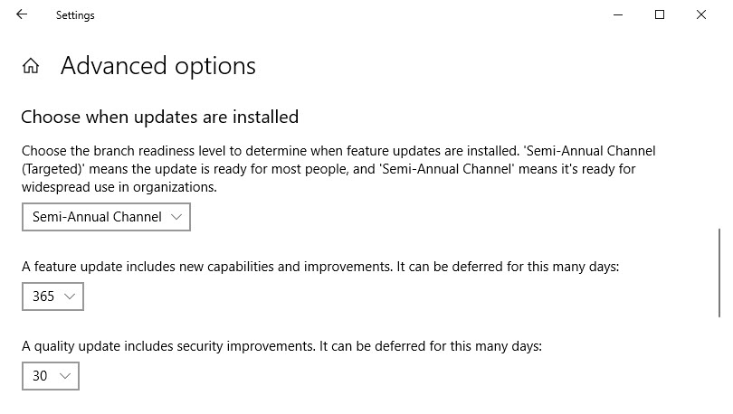 Ở tùy chọn “A quality update includes security improvements...”: Các cập nhật bao gồm các cải tiến và bảo mật. Bạn có thể tùy chỉnh trì hoãn nhiều nhất là 30 ngày.